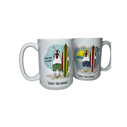 Living the Dream Rooster Mug – 15oz Surf Mug – From Coop to Coast