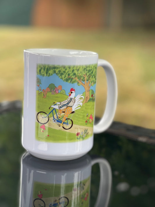 Whimsical Rooster Park Mug – 15oz Coffee Cup with Biking Rooster & Squirrels
