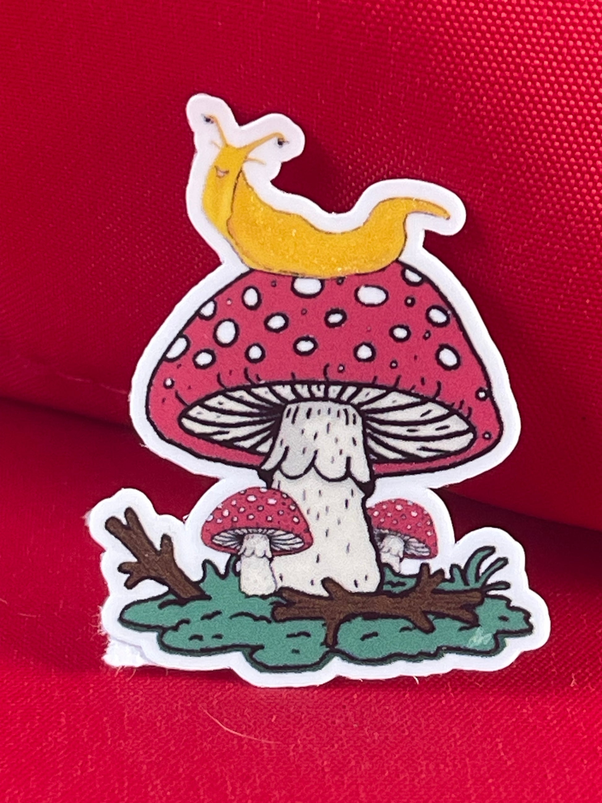 Banana Slug on Amanita Mushroom Vinyl Sticker – Whimsical Nature Design