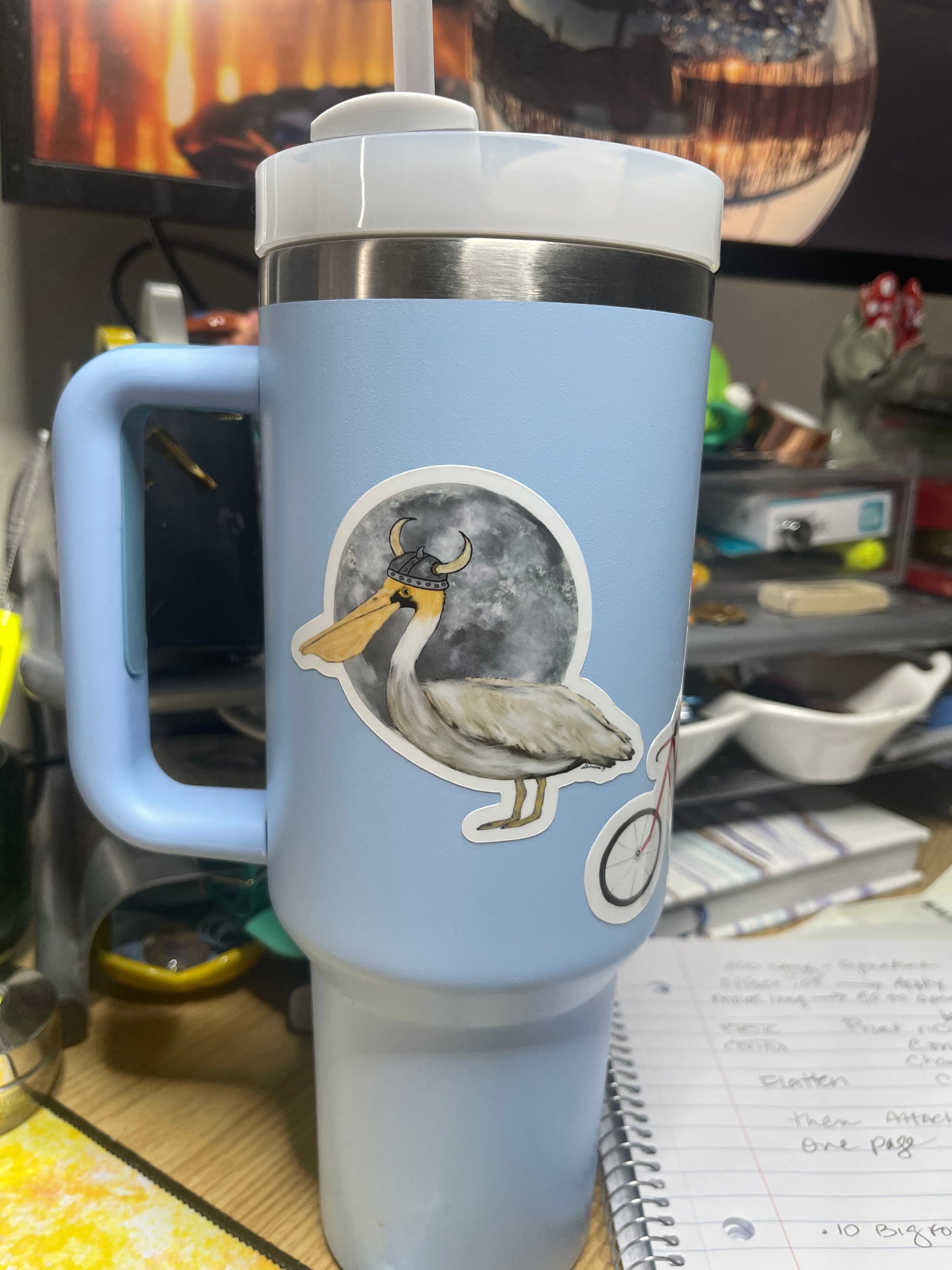 Sail into whimsy with this Viking pelican sticker featuring a mighty pelican in front of a glowing full moon. With Nordic-inspired flair and a touch of fantasy, this unique vinyl decal brings humor and charm to your everyday essentials.
